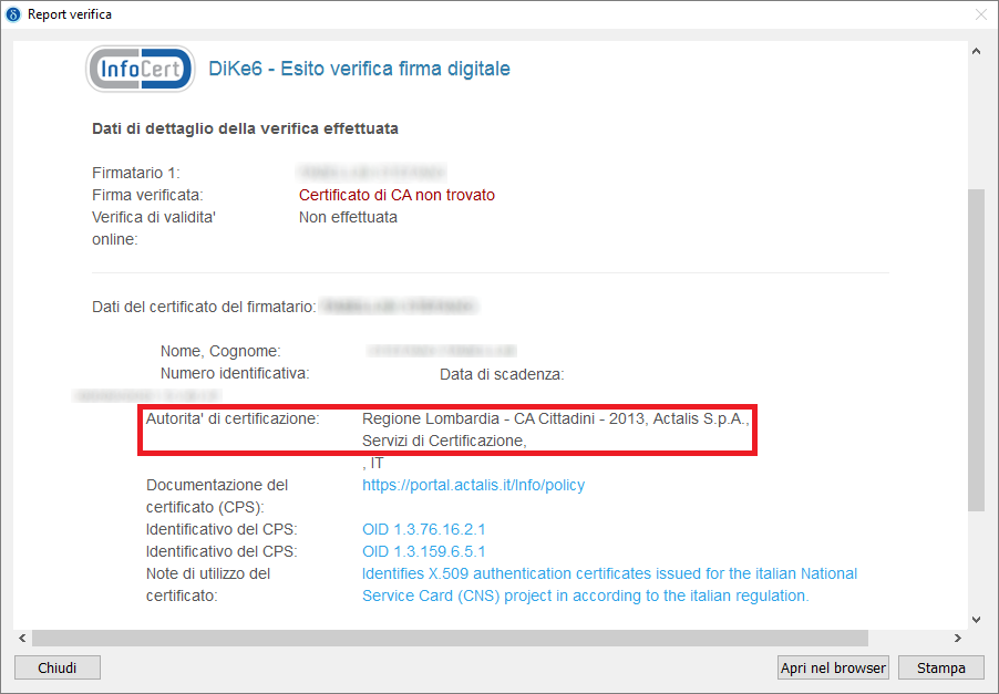 Se stai utilizzando DiKe, ad esempio, per verificare se al documento è effettivamente apposta una firma elettronica avanzata tramite la TS-CNS o la CIE clicca sul pulsante Report e verifica chi è la certification authority emittente: